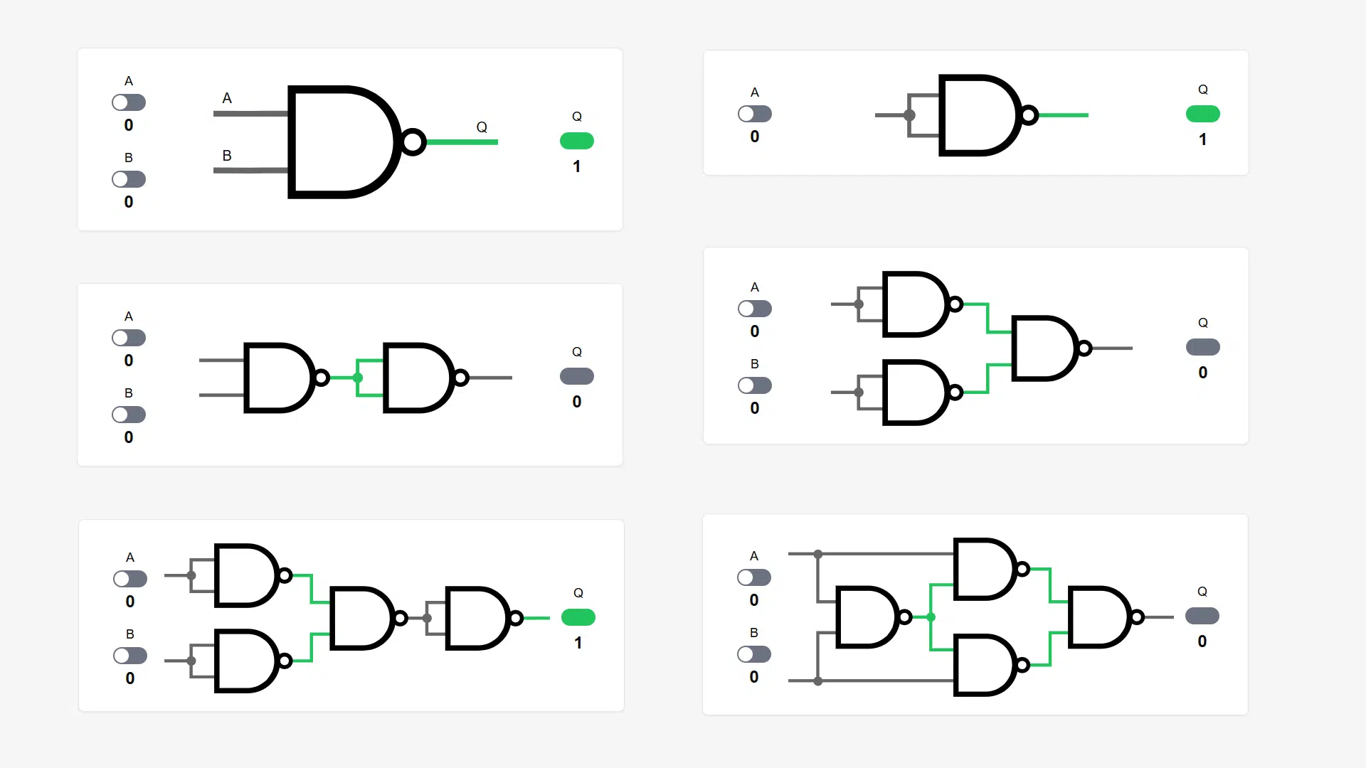 An AND gate is just a NAND with an inverted output, and we already know how to make an inverter from NAND, so let’s chain them together to implement AND using NAND logic.
